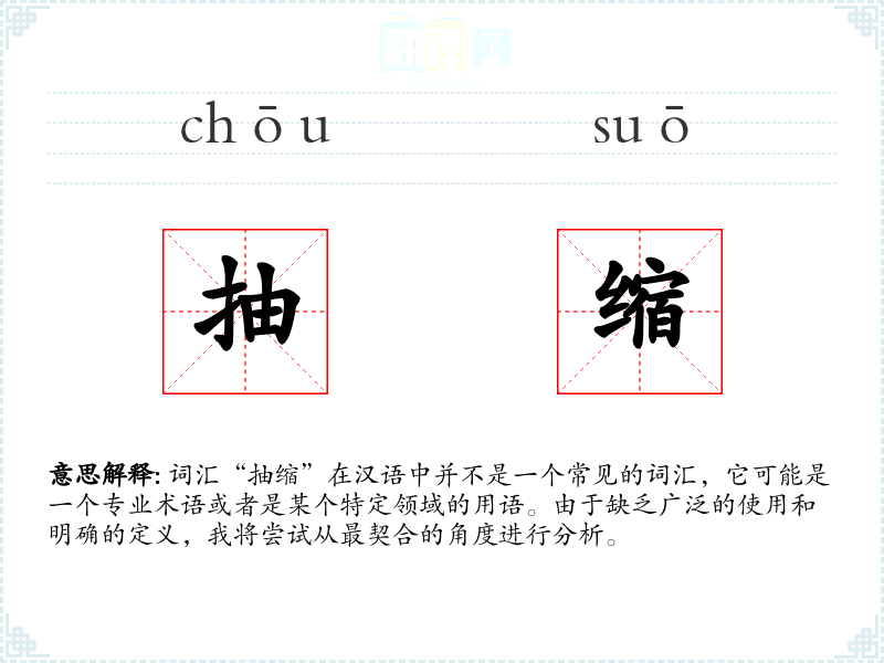 词汇“抽缩”在汉语中并不是一个常见的词汇,它可能是一个专业术语或者是某个特定领域的用语。由于缺乏广泛的使用和明确的定义,我将尝试从最契合的角度进行分析。