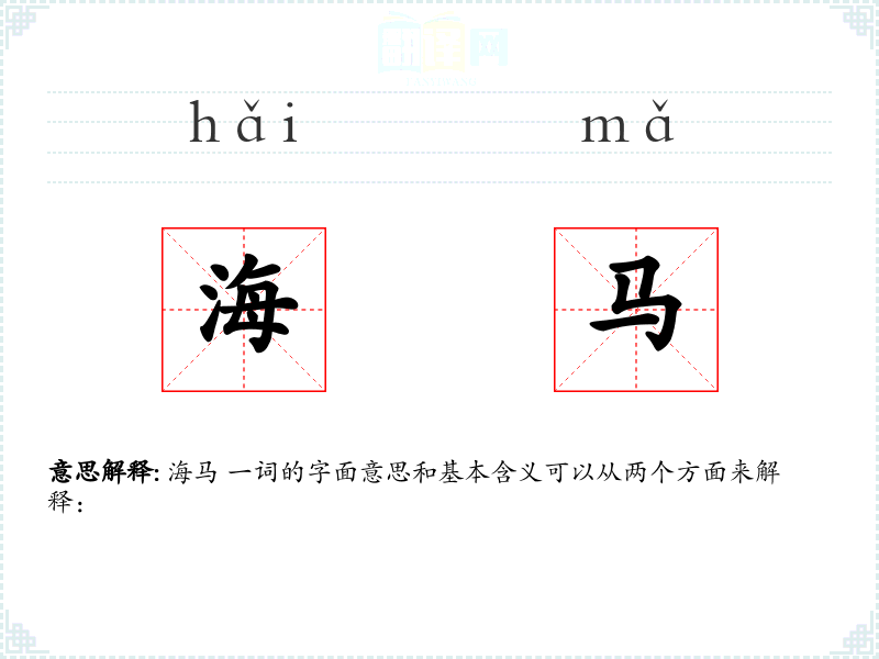海马 一词的字面意思和基本含义可以从两个方面来解释: