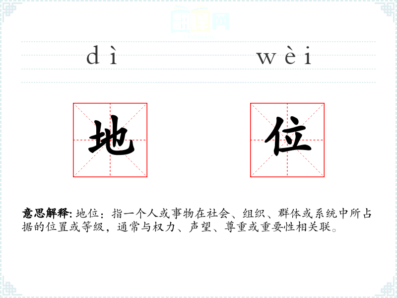 地位:指一个人或事物在社会、组织、群体或系统中所占据的位置或等级,通常与权力、声望、尊重或重要性相关联。
