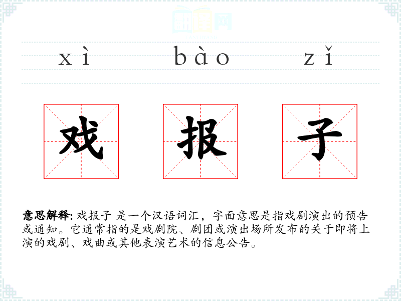 戏报子 是一个汉语词汇,字面意思是指戏剧演出的预告或通知。它通常指的是戏剧院、剧团或演出场所发布的关于即将上演的戏剧、戏曲或其他表演艺术的信息公告。