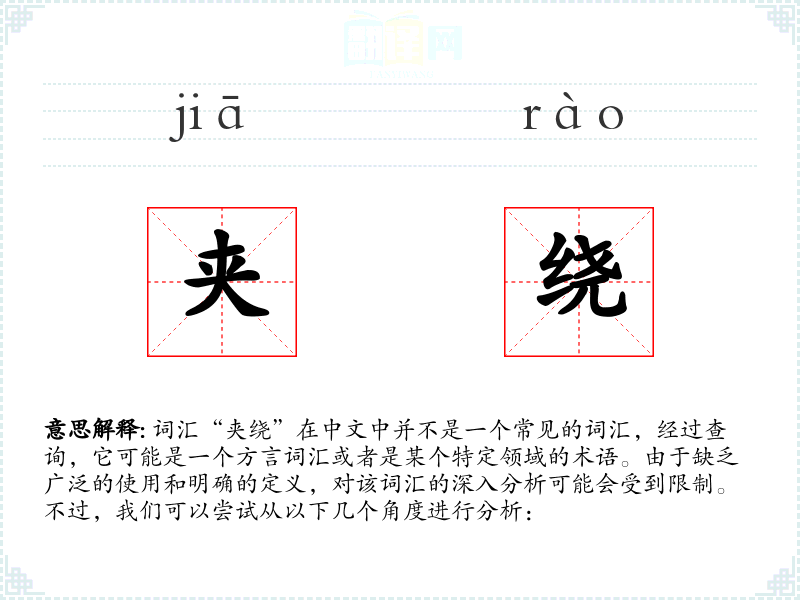 综上所述,由于“夹绕”不是一个标准的中文词汇,对其进行深入分析存在很大的困难。如果“夹绕”是某个特定领域的术语或者是方言词汇,可能需要更具体的信息和语境才能进行有效的分析。