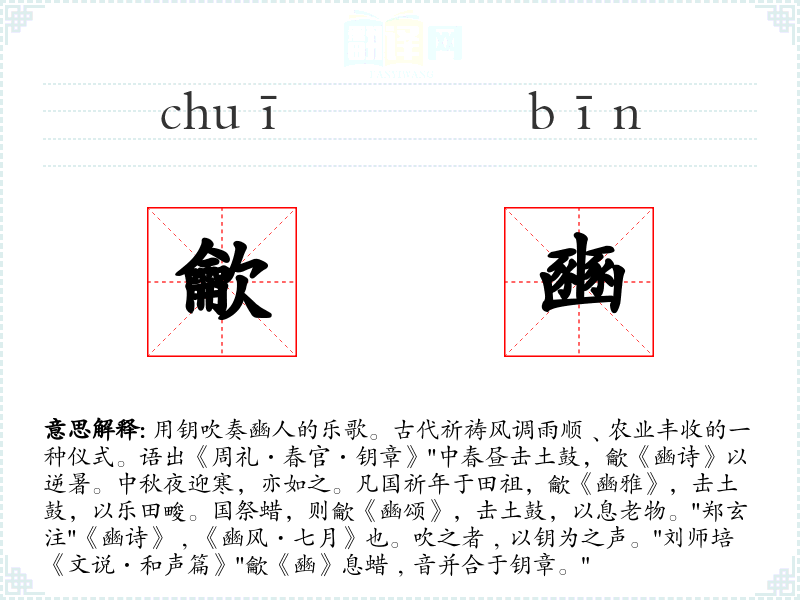 1.用钥吹奏豳人的乐歌。古代祈祷风调雨顺﹑农业丰收的一种仪式。语出《周礼·春官·钥章》"中春昼击土鼓,龡《豳诗》以逆暑。中秋夜迎寒,亦如之。凡国祈年于田祖,龡《豳雅》,击土鼓,以乐田畯。国祭蜡,则龡《豳颂》,击土鼓,以息老物。"郑玄注"《豳诗》﹐《豳风·七月》也。吹之者﹐以钥为之声。"刘师培《文说·和声篇》"龡《豳》息蜡﹐音并合于钥章。"