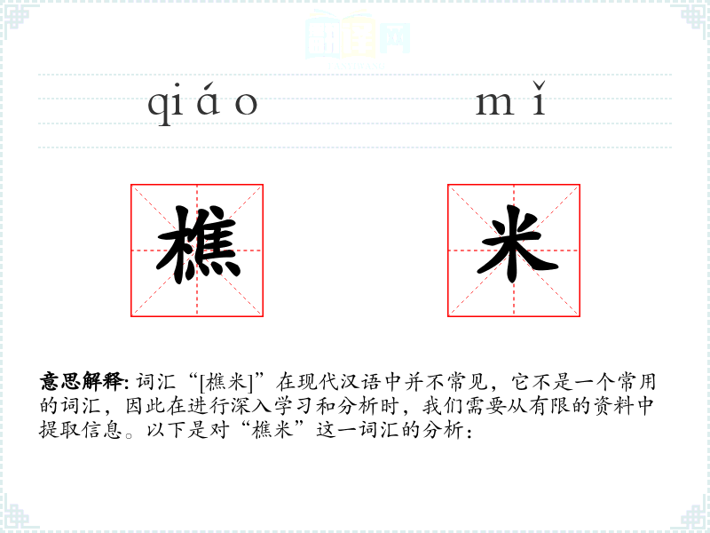 词汇“[樵米]”在现代汉语中并不常见,它不是一个常用的词汇,因此在进行深入学习和分析时,我们需要从有限的资料中提取信息。以下是对“樵米”这一词汇的分析: