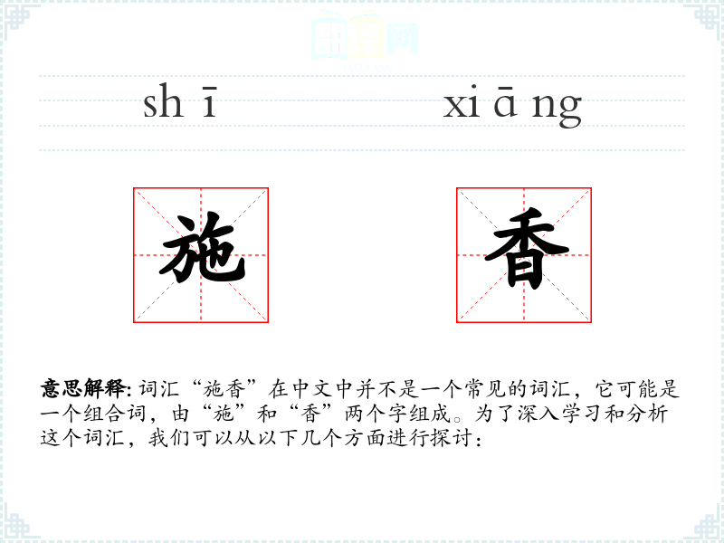 总结来说,“施香”这个词汇虽然不常见,但它蕴含了丰富的文化和社会意义,通过深入学*和分析,我们可以更好地理解和运用它。