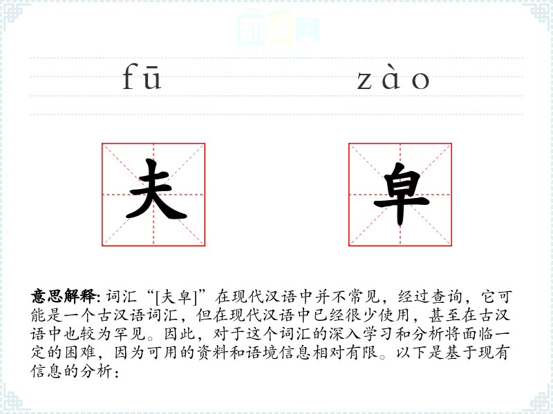 词汇“[夫皁]”在现代汉语中并不常见,经过查询,它可能是一个古汉语词汇,但在现代汉语中已经很少使用,甚至在古汉语中也较为罕见。因此,对于这个词汇的深入学*和分析将面临一定的困难,因为可用的资料和语境信息相对有限。以下是基于现有信息的分析: