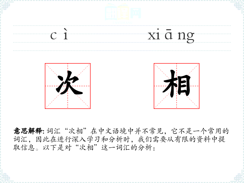 “次相”由“次”和“相”两个字组成。“次”表示次要、次等,“相”在古代汉语中表示相位、状态。在现代汉语中,“相”更多用于表示相互关系或外貌。