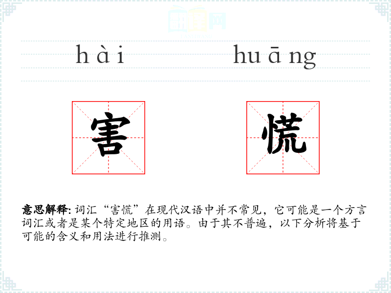 词汇“害慌”在现代汉语中并不常见,它可能是一个方言词汇或者是某个特定地区的用语。由于其不普遍,以下分析将基于可能的含义和用法进行推测。