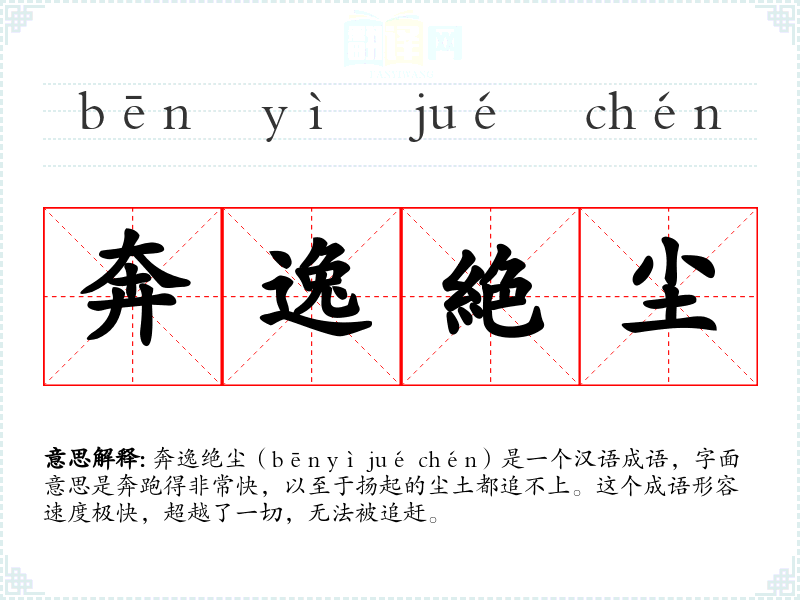 奔逸绝尘(bēn yì jué chén)是一个汉语成语,字面意思是奔跑得非常快,以至于扬起的尘土都追不上。这个成语形容速度极快,超越了一切,无法被追赶。