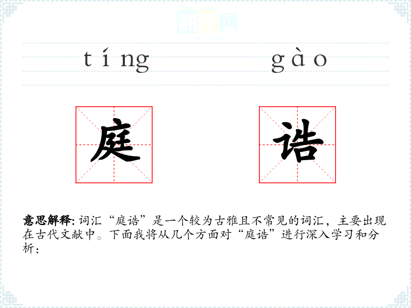 “庭诰”一词的字面意思是指在庭院中进行的正式宣告或训诫。其中,“庭”指的是庭院,而“诰”则是指古代帝王对臣子的训诫或宣告。
