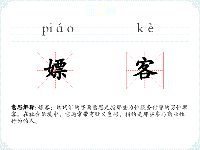 嫖客:该词汇的字面意思是指那些为性服务付费的男性顾客。在社会语境中,它通常带有贬义色彩,指的是那些参与商业性行为的人。
