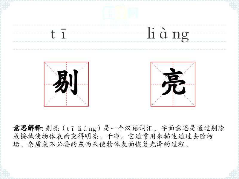 剔亮(tī liàng)是一个汉语词汇,字面意思是通过剔除或擦拭使物体表面变得明亮、干净。它通常用来描述通过去除污垢、杂质或不必要的东西来使物体表面恢复光泽的过程。