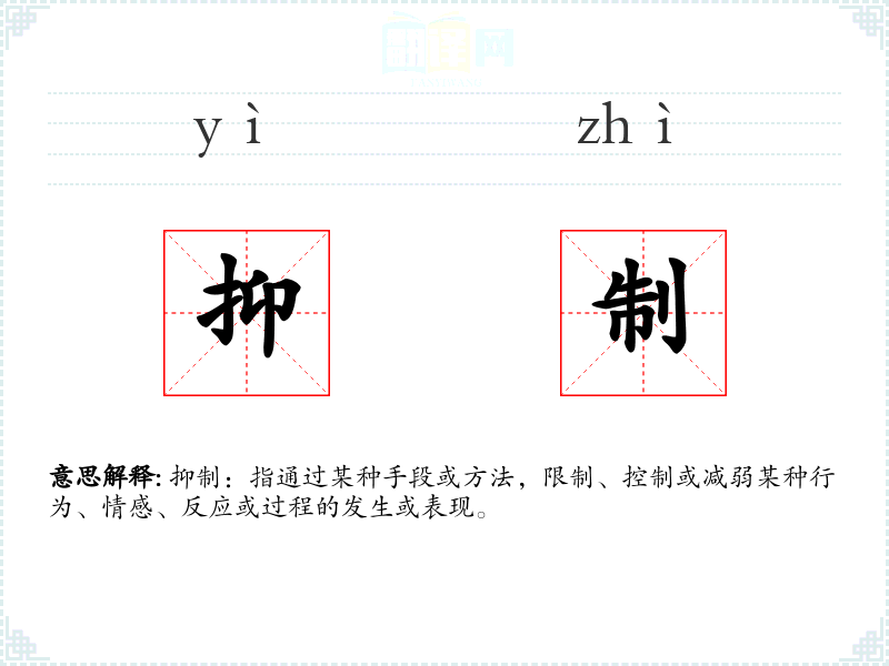 抑制:指通过某种手段或方法,限制、控制或减弱某种行为、情感、反应或过程的发生或表现。