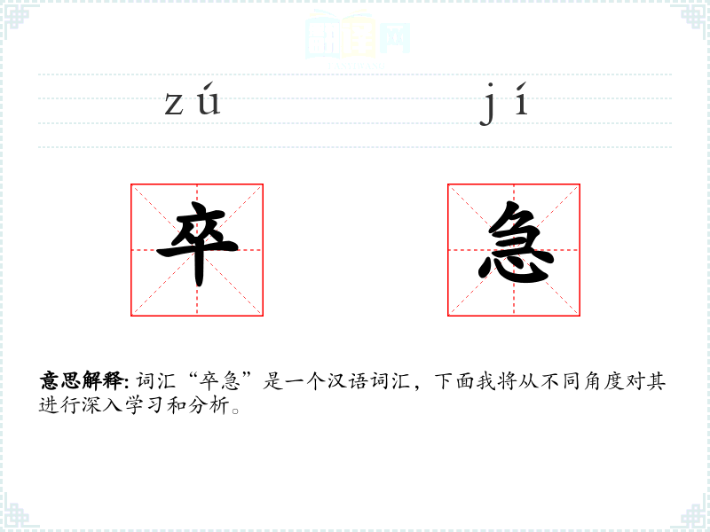 “卒”字在古代汉语中有“突然”的意思,“急”则表示“快速”或“紧迫”。两者结合,形成了“卒急”这个词汇,描述一种突然且急促的状态。