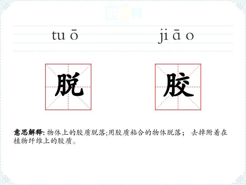 物体上的胶质脱落;用胶质粘合的物体脱落; 去掉附着在植物纤维上的胶质。