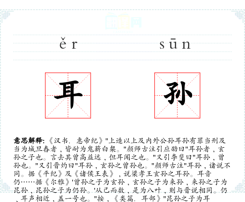 《汉书.惠帝纪》"上造以上及内外公孙耳孙有罪当刑及当为城旦舂者﹐皆耐为鬼薪白粲。"颜师古注引应劭曰"耳孙者﹐玄孙之子也。言去其曾高益远﹐但耳闻之也。"又引李斐曰"耳孙﹐曾孙也。"又引晋灼曰"耳孙﹐玄孙之曾孙也。"颜师古注"耳孙﹐诸说不同。据《平纪》及《诸侯王表》﹐说梁孝王玄孙之耳孙。耳音仍……据《尔雅》'曾孙之子为玄孙﹐玄孙之子为来孙﹐来孙之子为昆孙﹐昆孙之子为仍孙。'从己而数﹐是为八叶﹐则与晋说相同。仍﹑耳声相近﹐盖一号也。"按﹐《类篇.耳部》"昆孙之子为耳孙。"后多以"耳孙"泛指远代子孙。