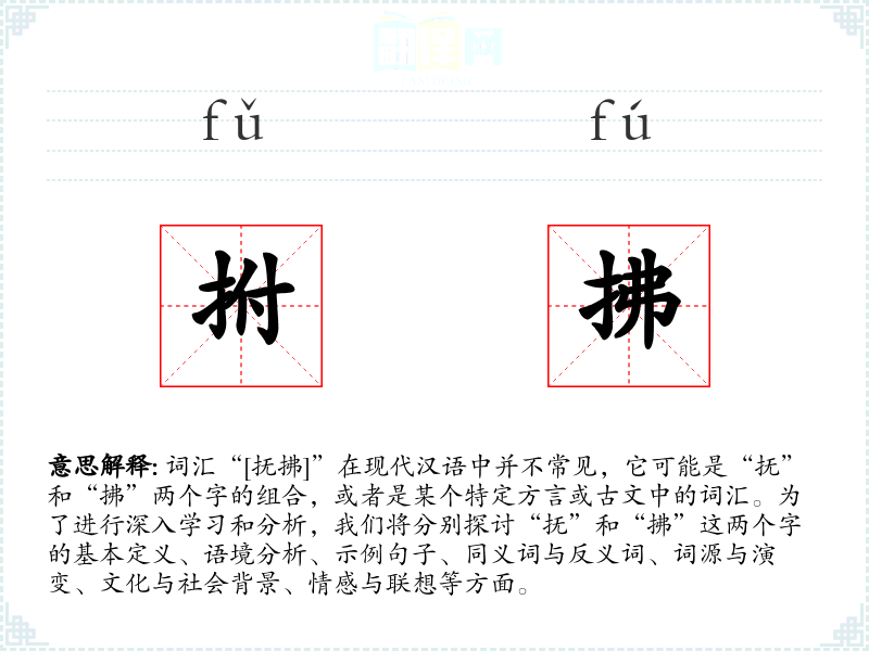词汇“[抚拂]”在现代汉语中并不常见,它可能是“抚”和“拂”两个字的组合,或者是某个特定方言或古文中的词汇。为了进行深入学习和分析,我们将分别探讨“抚”和“拂”这两个字的基本定义、语境分析、示例句子、同义词与反义词、词源与演变、文化与社会背景、情感与联想等方面。