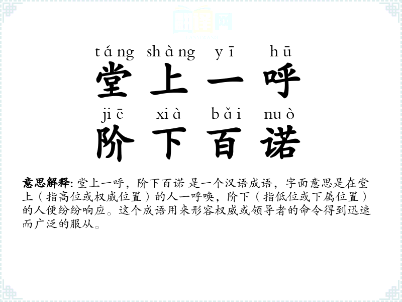 堂上一呼,阶下百诺 是一个汉语成语,字面意思是在堂上(指高位或权威位置)的人一呼唤,阶下(指低位或下属位置)的人便纷纷响应。这个成语用来形容权威或领导者的命令得到迅速而广泛的服从。
