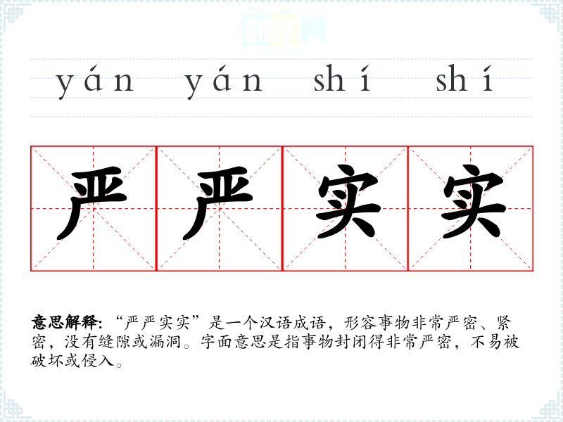 “严严实实”是一个汉语成语,形容事物非常严密、紧密,没有缝隙或漏洞。字面意思是指事物封闭得非常严密,不易被破坏或侵入。