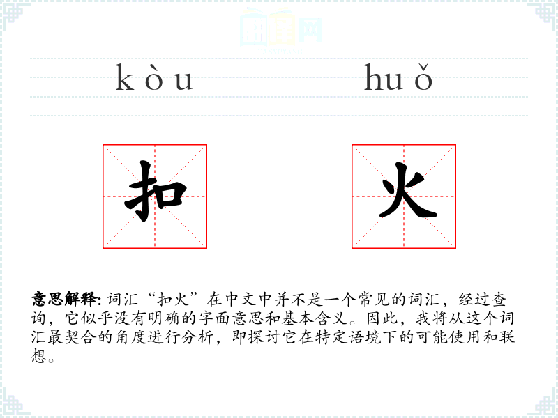 由于“扣火”不是一个标准词汇,我们无法给出一个确切的基本定义。它可能是某个方言词汇,或者是特定行业或社群中的术语。