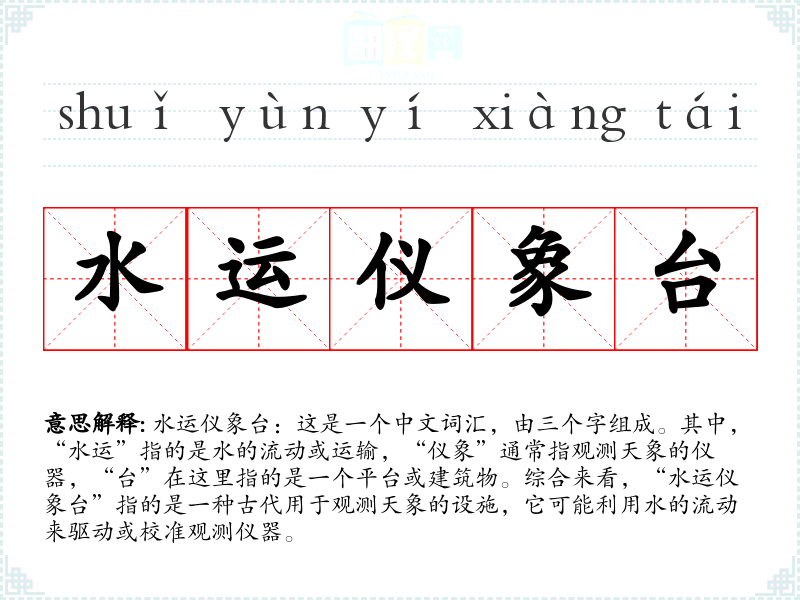 水运仪象台:这是一个中文词汇,由三个字组成。其中,“水运”指的是水的流动或运输,“仪象”通常指观测天象的仪器,“台”在这里指的是一个平台或建筑物。综合来看,“水运仪象台”指的是一种古代用于观测天象的设施,它可能利用水的流动来驱动或校准观测仪器。