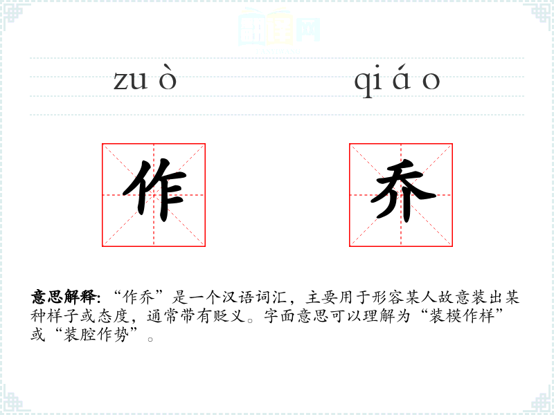 - 口语:在日常口语中,“作乔”常用来批评某人的不真诚或虚伪,如“别再作乔了,我们都知道你的真实想法。”