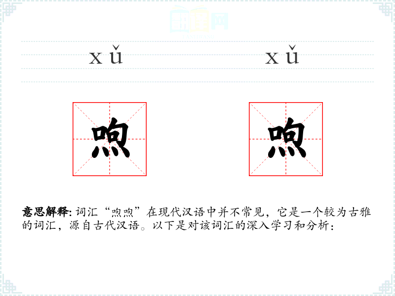 词汇“喣喣”在现代汉语中并不常见,它是一个较为古雅的词汇,源自古代汉语。以下是对该词汇的深入学习和分析: