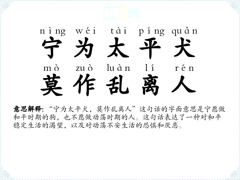 “宁为太平犬,莫作乱离人”这句话的字面意思是宁愿做和平时期的狗,也不愿做动荡时期的人。这句话表达了一种对和平稳定生活的渴望,以及对动荡不安生活的恐惧和厌恶。