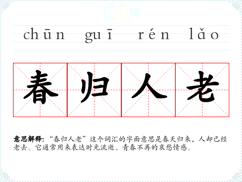 “春归人老”这个词汇的字面意思是春天归来,人却已经老去。它通常用来表达时光流逝、青春不再的哀愁情感。