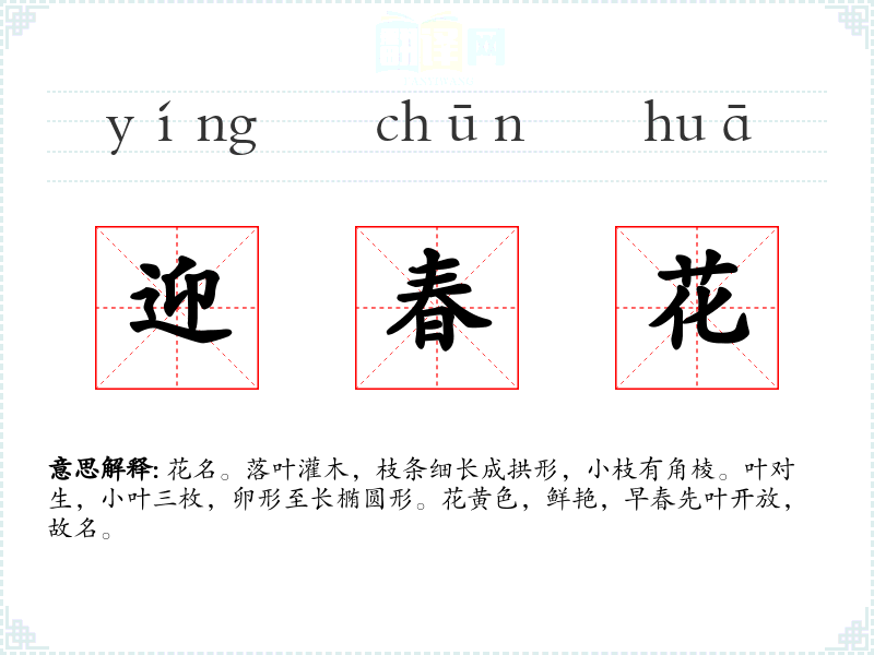 花名。落叶灌木,枝条细长成拱形,小枝有角棱。叶对生,小叶三枚,卵形至长椭圆形。花黄色,鲜艳,早春先叶开放,故名。