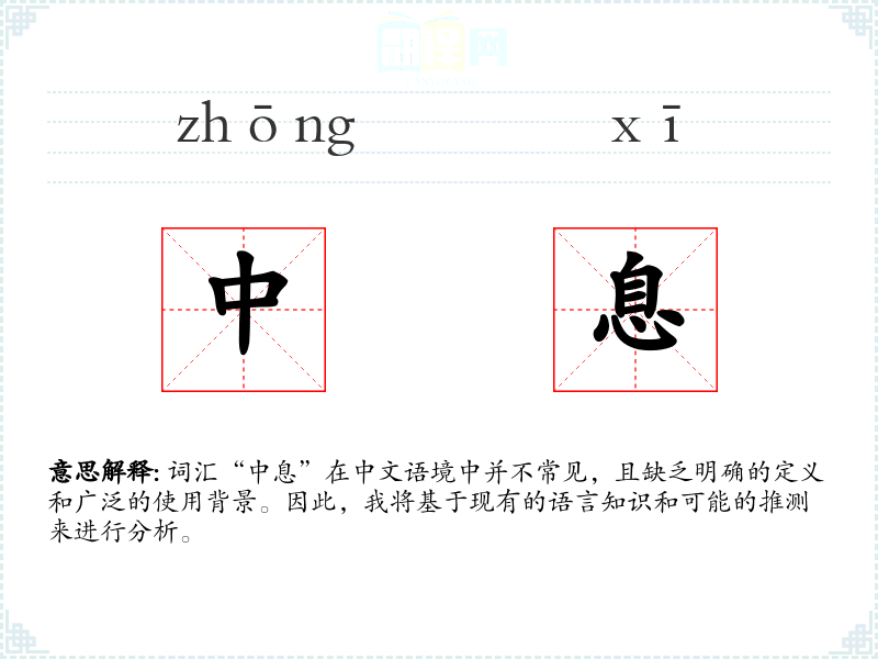 “中息”字面意思可能指的是“中间的休息”或“中途的停顿”。然而,这个词汇在中文标准语中并不常用,可能在一些特定的行业或领域中有特定的含义。
