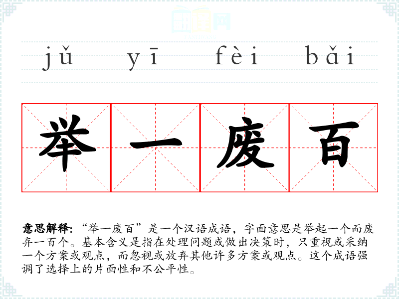 “举一废百”是一个汉语成语,字面意思是举起一个而废弃一百个。基本含义是指在处理问题或做出决策时,只重视或采纳一个方案或观点,而忽视或放弃其他许多方案或观点。这个成语强调了选择上的片面性和不公平性。