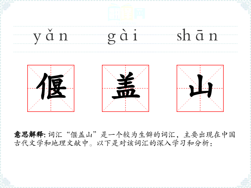 词汇“偃盖山”是一个较为生僻的词汇,主要出现在*古代文学和地理文献中。以下是对该词汇的深入学和分析: