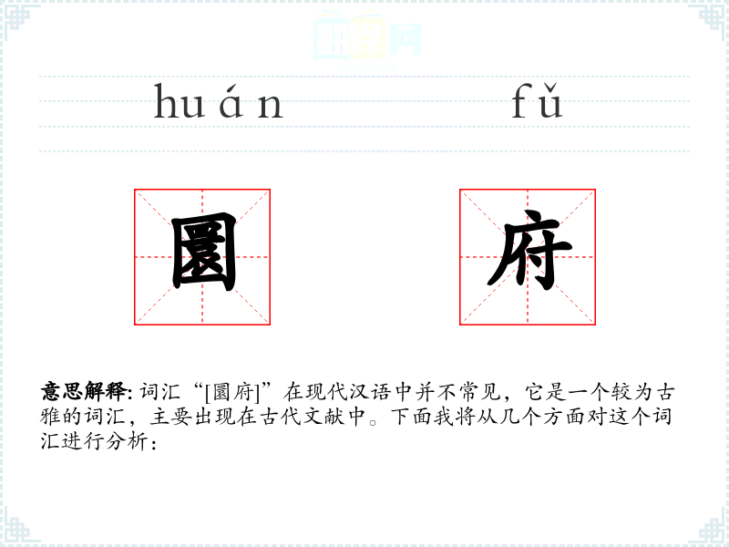 词汇“[圜府]”在现代汉语中并不常见,它是一个较为古雅的词汇,主要出现在古代文献中。下面我将从几个方面对这个词汇进行分析: