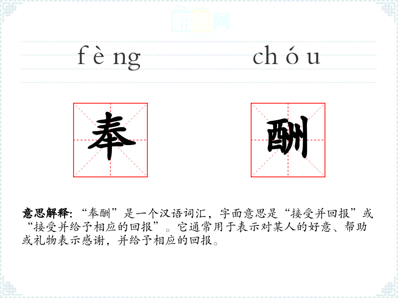 “奉酬”由“奉”和“酬”两个字组成。“奉”原意为恭敬地给予或接受,“酬”原意为回报或报酬。在古代汉语中,“奉酬”常用于正式的文书或礼仪场合,随着时间的推移,其使用范围逐渐扩大,但仍保持一定的正式和庄重感。