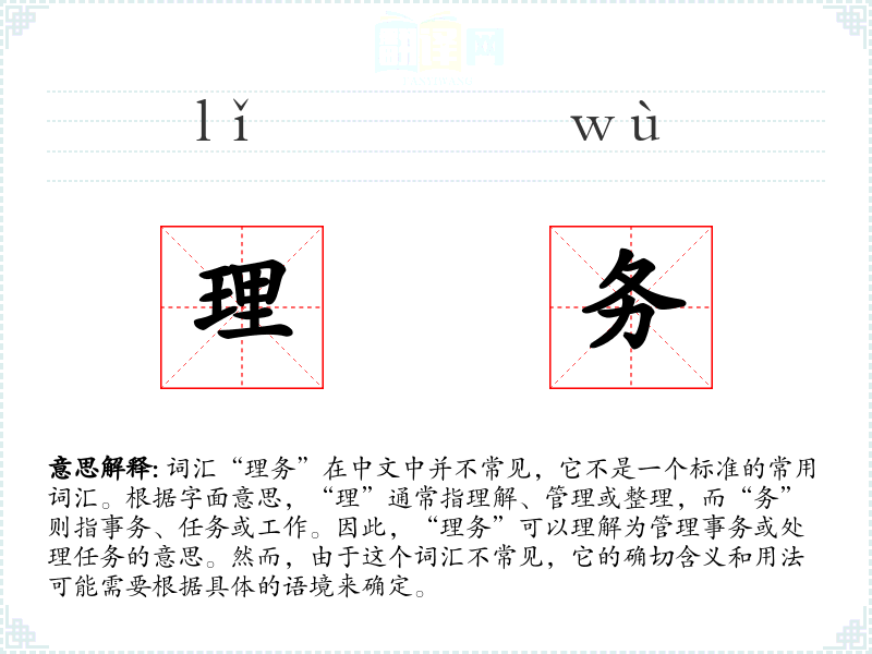 - 由于“理务”不是一个常用词汇,其词源和演变不太明确。可能是由“理”和“务”两个常用词汇组合而成的新词。