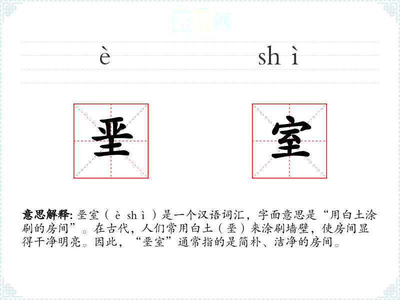 垩室(è shì)是一个汉语词汇,字面意思是“用白土涂刷的房间”。在古代,人们常用白土(垩)来涂刷墙壁,使房间显得干净明亮。因此,“垩室”通常指的是简朴、洁净的房间。