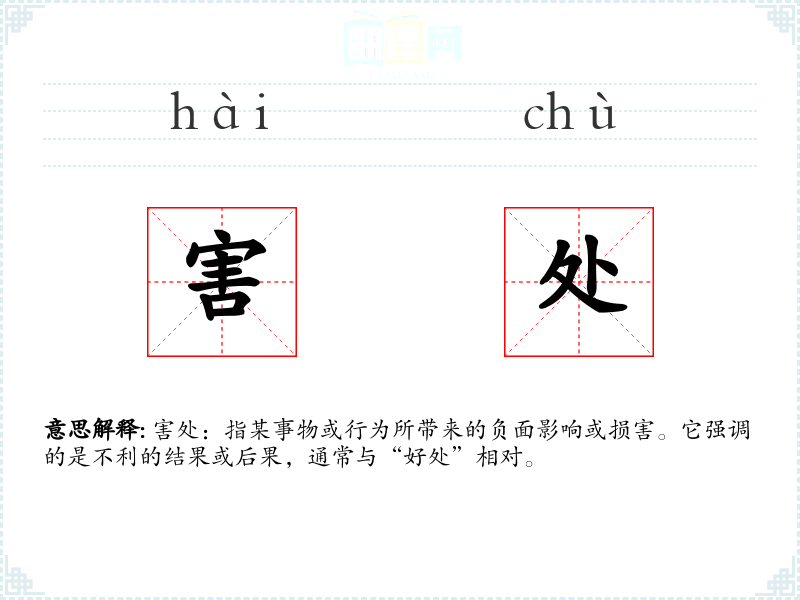 害处:指某事物或行为所带来的负面影响或损害。它强调的是不利的结果或后果,通常与“好处”相对。