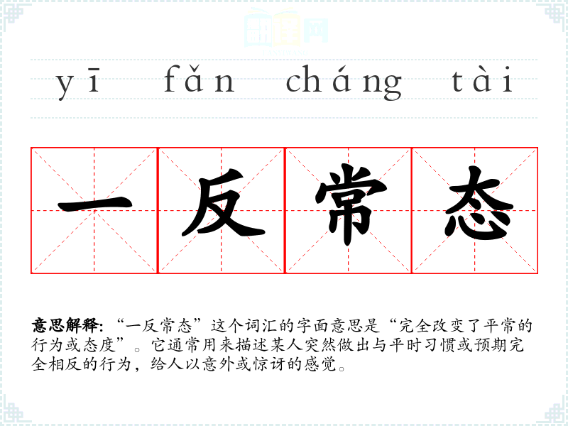 "一反常态"的意思解释、一反常态是什么意思由翻译网汉语词典查词提供。