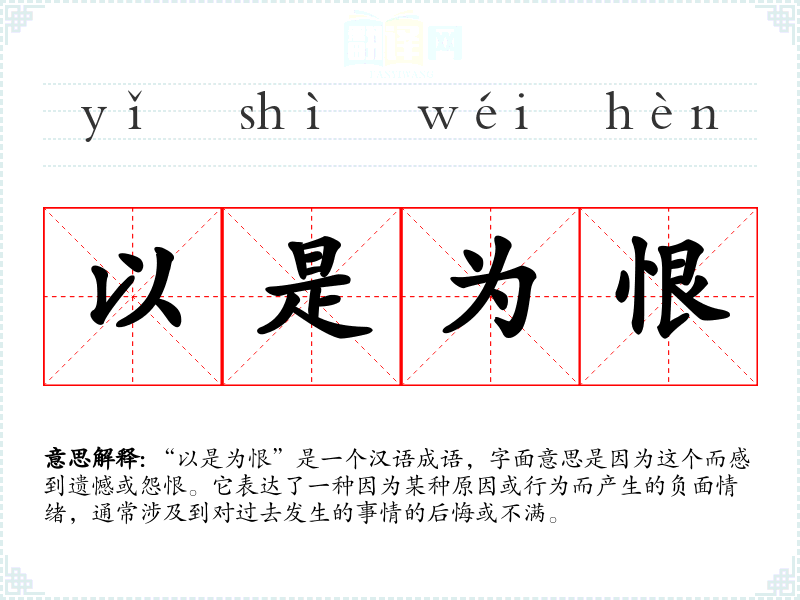 “以是为恨”是一个汉语成语,字面意思是因为这个而感到遗憾或怨恨。它表达了一种因为某种原因或行为而产生的负面情绪,通常涉及到对过去发生的事情的后悔或不满。