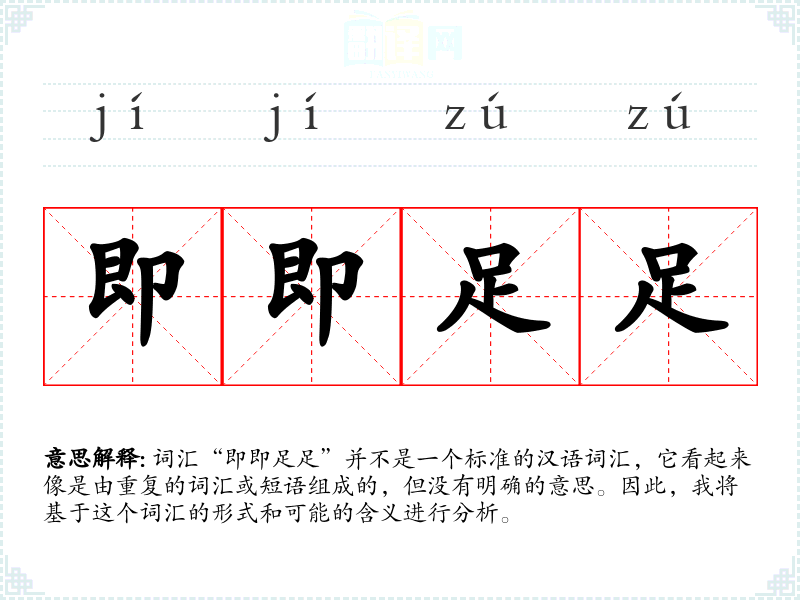 词汇“即即足足”并不是一个标准的汉语词汇,它看起来像是由重复的词汇或短语组成的,但没有明确的意思。因此,我将基于这个词汇的形式和可能的含义进行分析。