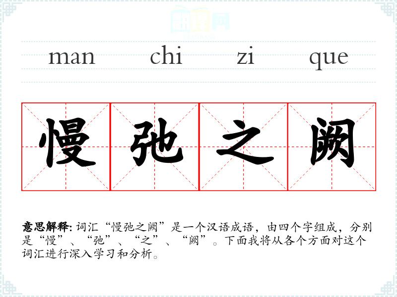 词汇“慢弛之阙”是一个汉语成语,由四个字组成,分别是“慢”、“弛”、“之”、“阙”。下面我将从各个方面对这个词汇进行深入学*和分析。