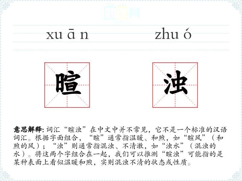 词汇“暄浊”在中文中并不常见,它不是一个标准的汉语词汇。根据字面组合,“暄”通常指温暖、和煦,如“暄风”(和煦的风);“浊”则通常指混浊、不清澈,如“浊水”(混浊的水)。将这两个字组合在一起,我们可以推测“暄浊”可能指的是某种表面上看似温暖和煦,实则混浊不清的状态或性质。