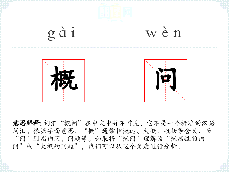 词汇“概问”在中文中并不常见,它不是一个标准的汉语词汇。根据字面意思,“概”通常指概述、大概、概括等含义,而“问”则指询问、问题等。如果将“概问”理解为“概括性的询问”或“大概的问题”,我们可以从这个角度进行分析。