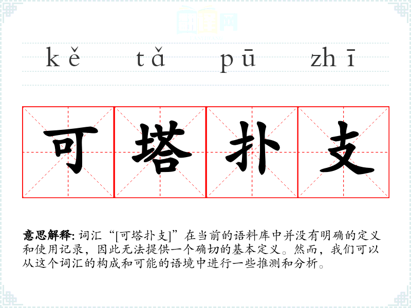 词汇“[可塔扑支]”在当前的语料库中并没有明确的定义和使用记录,因此无法提供一个确切的基本定义。然而,我们可以从这个词汇的构成和可能的语境中进行一些推测和分析。