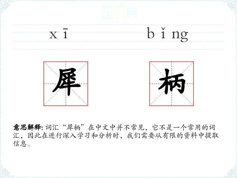 词汇“犀柄”在中文中并不常见,它不是一个常用的词汇,因此在进行深入学*和分析时,我们需要从有限的资料中提取信息。