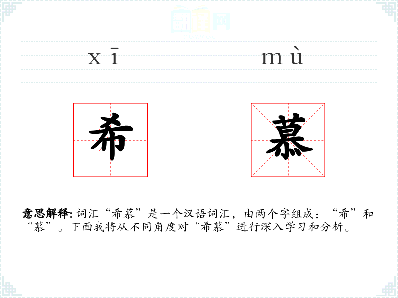 词汇“希慕”是一个汉语词汇,由两个字组成:“希”和“慕”。下面我将从不同角度对“希慕”进行深入学*和分析。