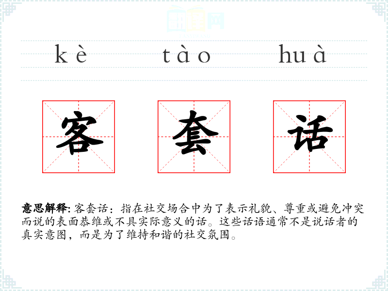 客套话:指在社交场合中为了表示礼貌、尊重或避免冲突而说的表面恭维或不具实际意义的话。这些话语通常不是说话者的真实意图,而是为了维持和谐的社交氛围。