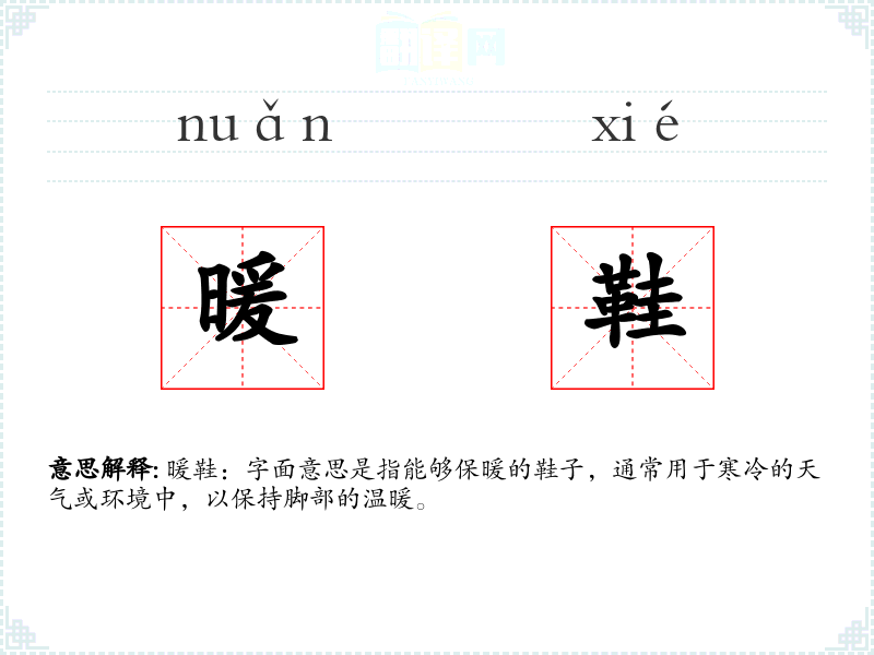 暖鞋:字面意思是指能够保暖的鞋子,通常用于寒冷的天气或环境中,以保持脚部的温暖。