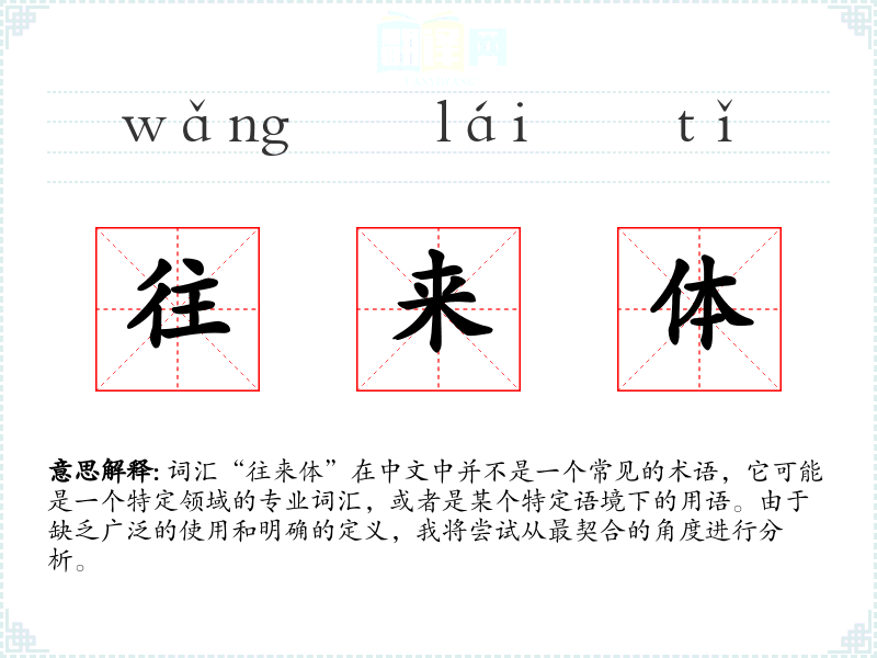 词汇“往来体”在中文中并不是一个常见的术语,它可能是一个特定领域的专业词汇,或者是某个特定语境下的用语。由于缺乏广泛的使用和明确的定义,我将尝试从最契合的角度进行分析。