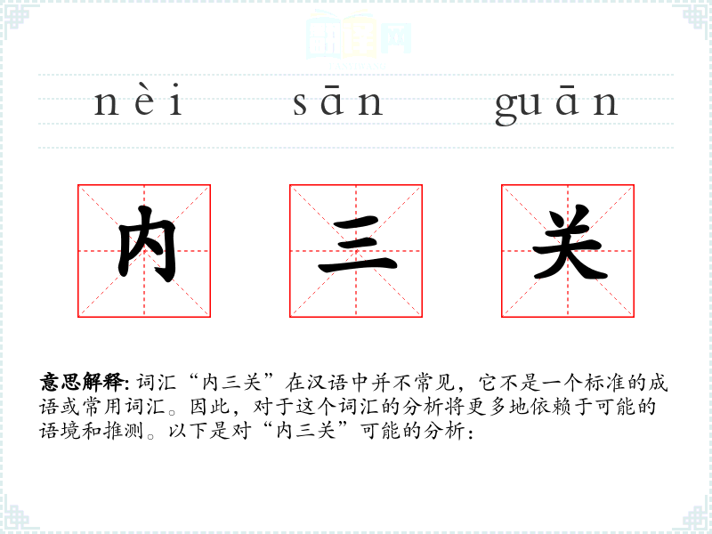 词汇“内三关”在汉语中并不常见,它不是一个标准的成语或常用词汇。因此,对于这个词汇的分析将更多地依赖于可能的语境和推测。以下是对“内三关”可能的分析: